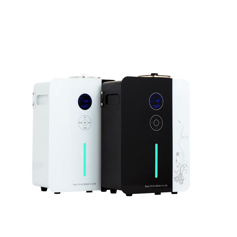 This commercial WiFi control electric scent diffuser machine is designed for large spaces like hotel lobbies, covering up to 2000 cubic meters. It features a touch screen, app control, and an 800ml oil bottle capacity. Made of high-quality aluminum alloy, it supports wall-mounted installation and HVAC system connection.