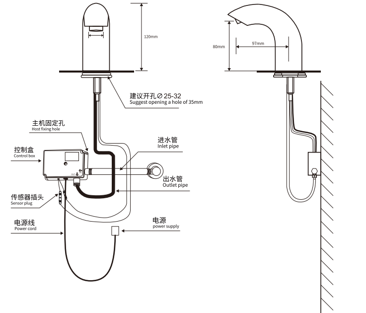 Item No: T-809 Material : Brass Power supply mode: DC(Battery type/DC6V) AC220V-250V Power supply mode AC110V AC/DC Inlet diameter: G1/2" Outlet pipe diameter :G1/2" Applicable water pressure :0.05~~0.8Mpa Working power :DC6V Static consumption :0.05MW<2W Sensing distance :Factory setting 20c Ambient temperature : 0℃-60℃ Operating Humidity : Above95%RH