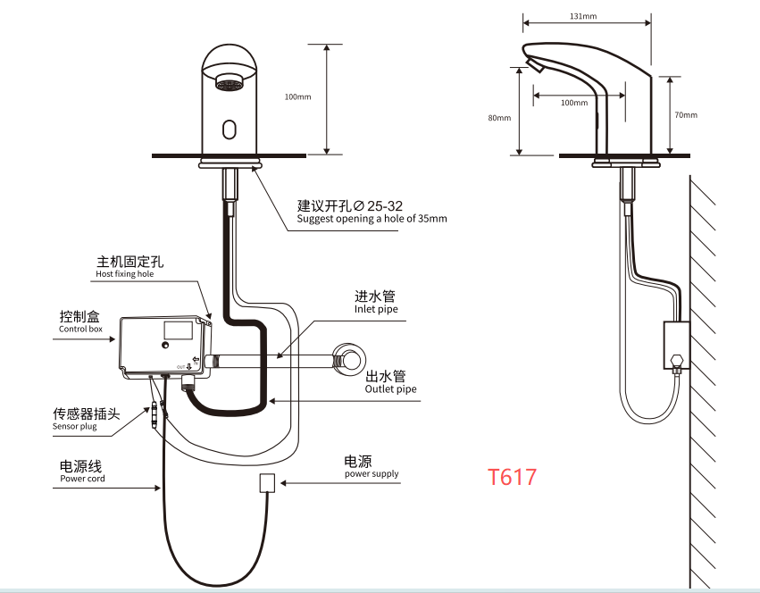 Item No: T-817 Material : Brass Power supply mode: DC(Battery type/DC6V) AC220V-250V Power supply mode AC110V AC/DC Inlet diameter: G1/2" Outlet pipe diameter :G1/2" Applicable water pressure :0.05~~0.8Mpa Working power :DC6V Static consumption :0.05MW<2W Sensing distance :Factory setting 20c Ambient temperature : 0℃-60℃ Operating Humidity : Above95%RH