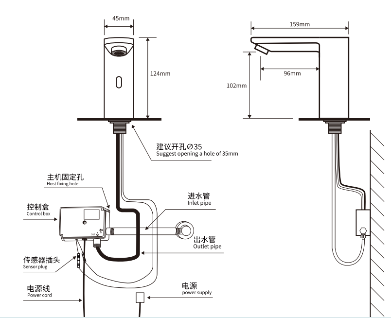 Item No: T-824 Material : Brass Power supply mode: DC(Battery type/DC6V) AC220V-250V Power supply mode AC110V AC/DC Inlet diameter: G1/2" Outlet pipe diameter :G1/2" Applicable water pressure :0.05~~0.8Mpa Working power :DC6V Static consumption :0.05MW<2W Sensing distance :Factory setting 20c Ambient temperature : 0℃-60℃ Operating Humidity : Above95%RH