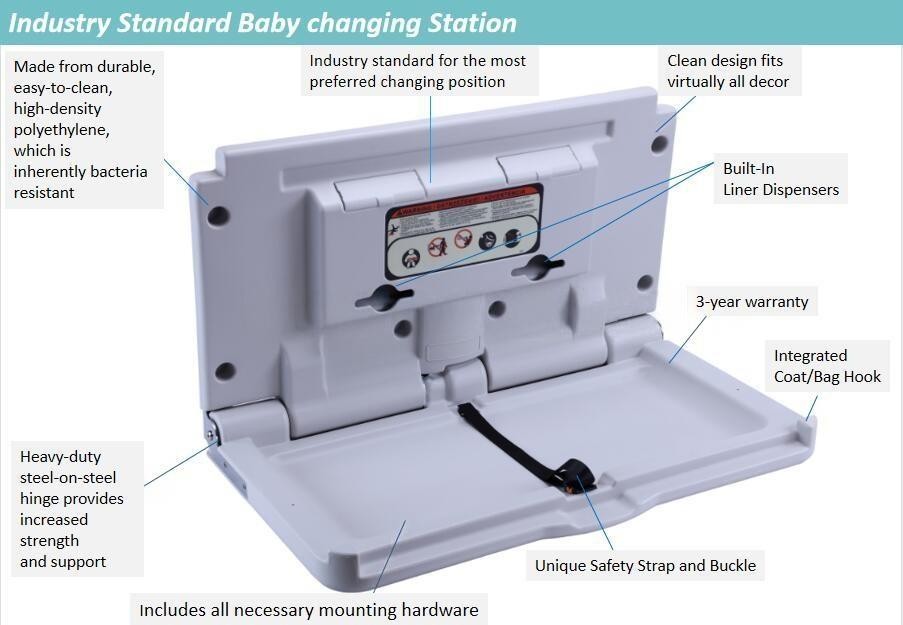 This wall-mounted baby changing station is made of bacterial-resistant polypropylene, ensuring safety and hygiene. It features a horizontal foldable design with dual protection safety belts, hooks, and line dispensers for convenience. The modern and stylish design blends seamlessly into any space, making it ideal for high-traffic public areas like shopping centers and airports.