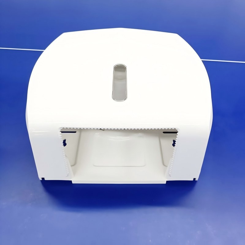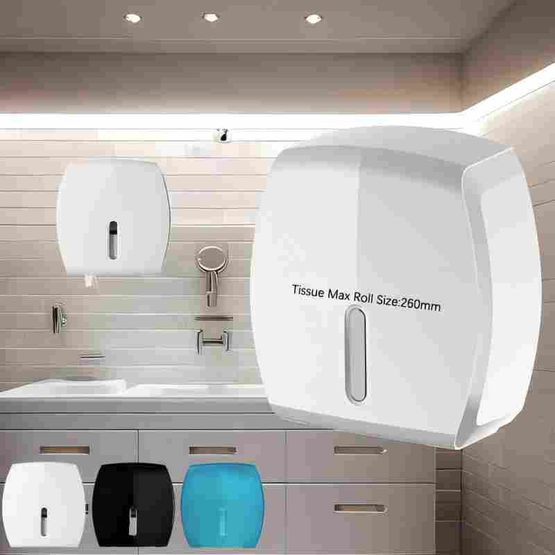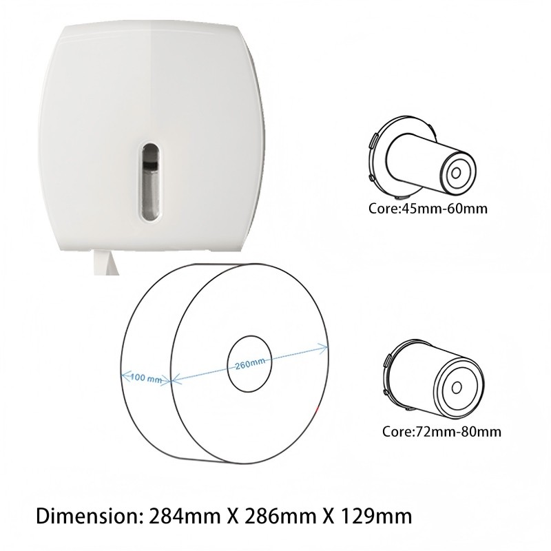The Jumbo Roll Tissue Dispenser features an interchangeable core, allowing it to accommodate various jumbo toilet tissues. It can hold jumbo rolls with a maximum diameter of 26cm, making it versatile and convenient for different market needs.